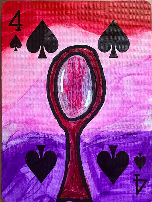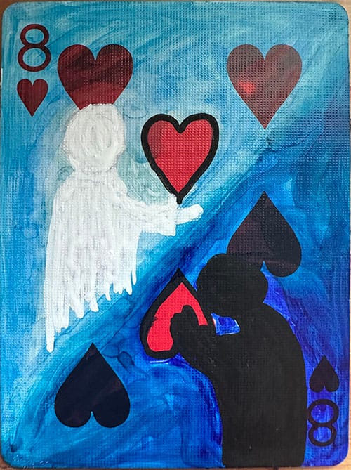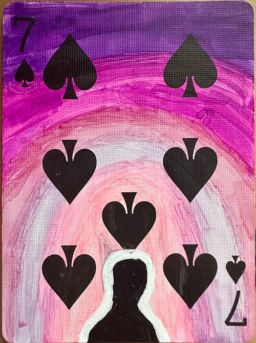 The card is upside down, and the center spade is giving knowledge to the person below. It is sacred knowledge that expands the consciousness, or is it knowledge that can cause harm? Only the person knows.