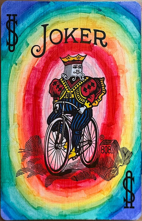 For the first joker, I decided to show him surrounded by a rainbow, as if he was riding through it. He's not sure exactly what he's riding through, but it's bright, and new, and full of light.